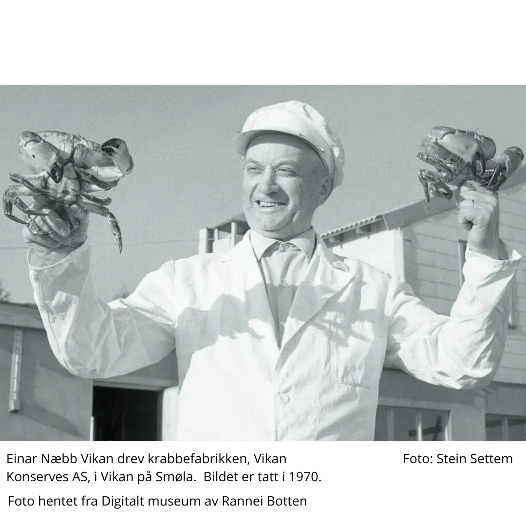 “Einar Næbb-Wikan drev landhandel i Vikan og i 1938 innredet han et naust til produksjonslokale for hermetisering av krabbe. Han brukte sin skapende fantasi og laget i samarbeid med dyktige medarbeidere, egne maskiner for fiskeproduksjon og hermetikk emballasje. Han var en kreativ sjel på mange områder, tegnet sine egne etiketter og skrev dikt.”
